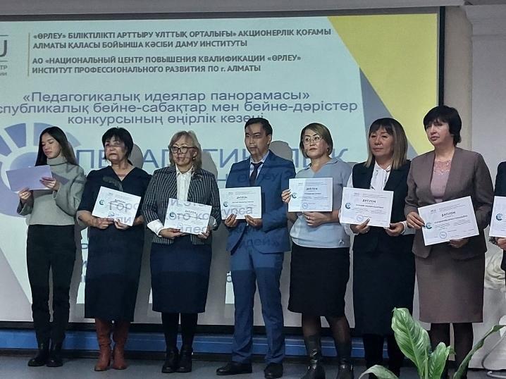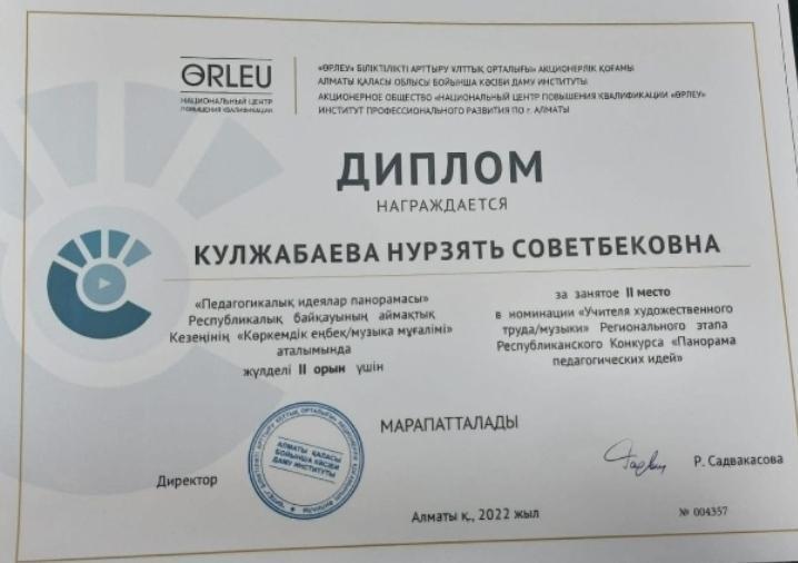 Қазан айында бірыңғай ақпараттық-білім кеңістігінде заманауи педагогикалық тәжірибені жинақтау және насихаттау, педагогтардың ақпараттық- коммуникациялық және технологиялық құзыреттіліктерін арттыру мақсатында «Өрлеу» БАҰО» АҚ Алматы қаласы кәсіби даму институтының ұйымдастыруымен өткен Мектепке дейінгі, орта, қосымша, техникалық және кәсіптік, жоғары білім ұйымдары үшін бейнесабақтар мен бейнедәрістердің жыл сайынғы «Педагогикалық идеялар панорамасы» Республикалық конкурсының аймақтық кезеңіне мектебіміздің тәжірибелі ұстазы, көркем еңбек пәнінің мұғалімі Кулжабаева Нурзять Советбекқызы қатысып, жүлделі 2-орынды жеңіп алды.