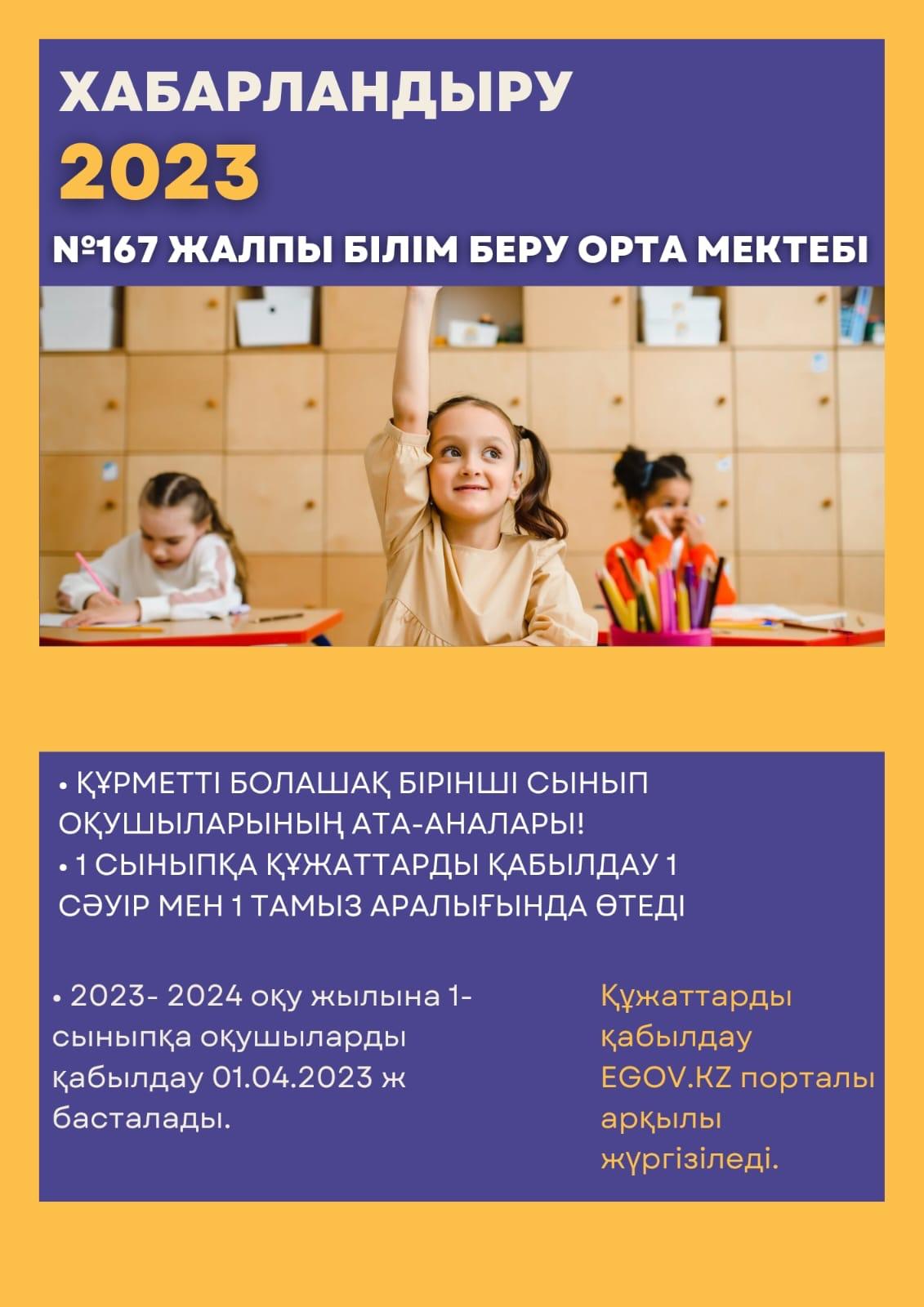 17 апрель 2023 0 1 2 3 4 5 Мектепке қабылдау туралы хабарландыру Хабарландыру!!! Құрметті болашақ бірінші сынып оқушыларының ата-аналары 1 сыныпқа құжаттарды қабылдау 1 сәуір мен 1 тамыз аралығында өтеді. Құжаттарды қабылдау EGOV.KZ порталы арқылы жүргізіледі. Осы беттің QR-коды:QR-код этой страницы: