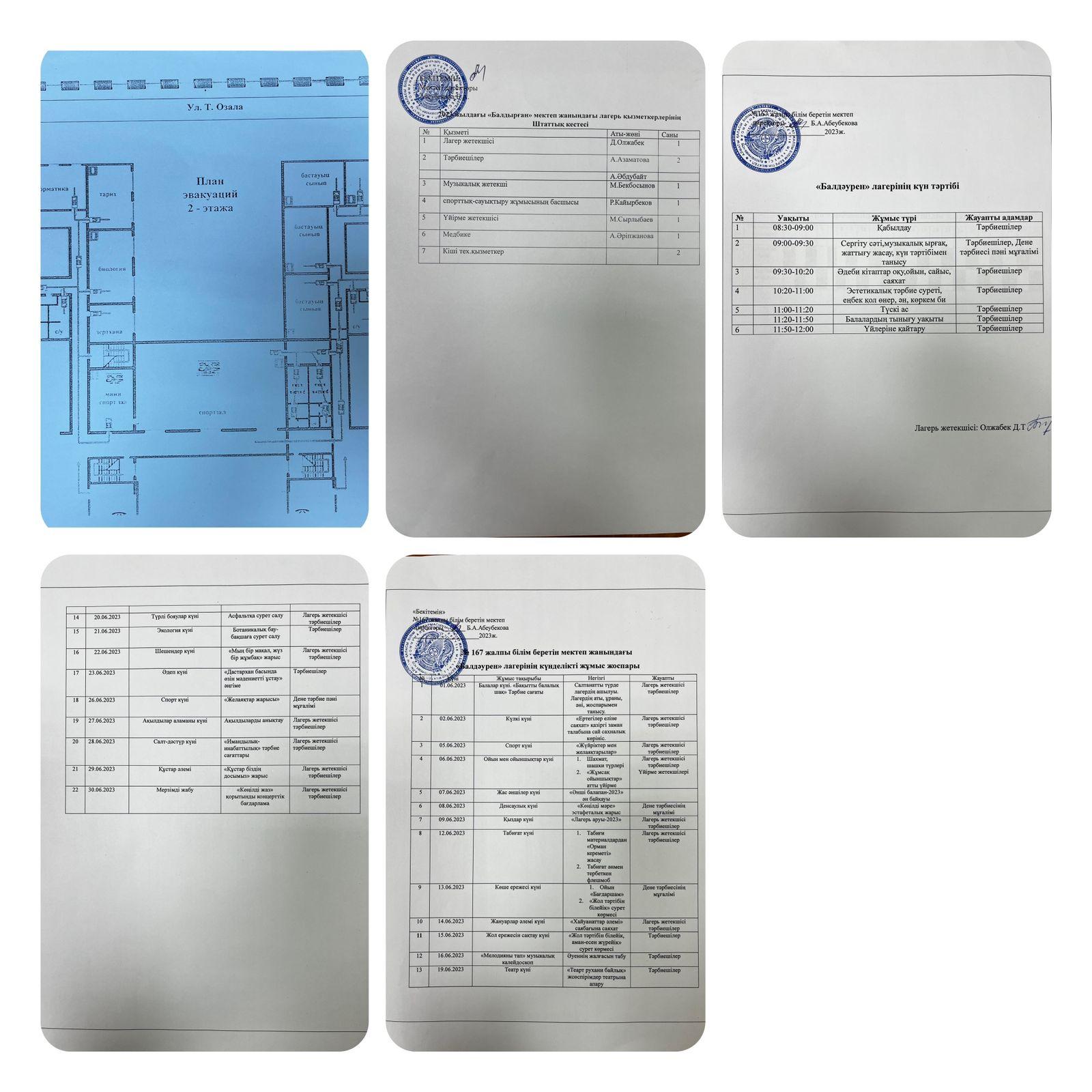 Бүгін мектебімізде бастауыш сынып оқушылары үшін жазғы лагерь өз жұмысын бастады. Мектеп жанынан құрылған "Балдаурен" лагері оқушылардың жазғы демалысының алғашқы кезеңдерін пайдалы етіп өткізу мақсатында ұйымдастырылды. Балаларға лагерде түрлі сауықтыру ойындарымен ойнауға және пайдалы істермен айналысуына мүмкіндік жасалған. Оқушылар жазғы сауықтыру лагерьінде ән мен биден шашу шашып , өлеңдерін оқып думанға бөледі Оқушыларға арналған түрлі іс-шаралар күнделікті жоспар бойынша жүргізіліп отырады. Мектеп тарапынан қадағаланып отырады.Тегін ыстық тамақпен қамьамасыз етіледі.