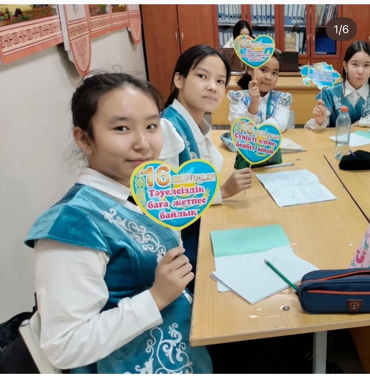 ҚР Тәуелсіздік күніне орай "Желтоқсан шежіресі-елімнің мәртебесі" бірыңғай сынып сағаты 1-11 сыныптарда өтті. Тәрбие сағаты барысында оқушылар Қазақстанның тәуелсіздік тарихы, елдің жетістіктері мен құндылықтары туралы ой бөлісті.
