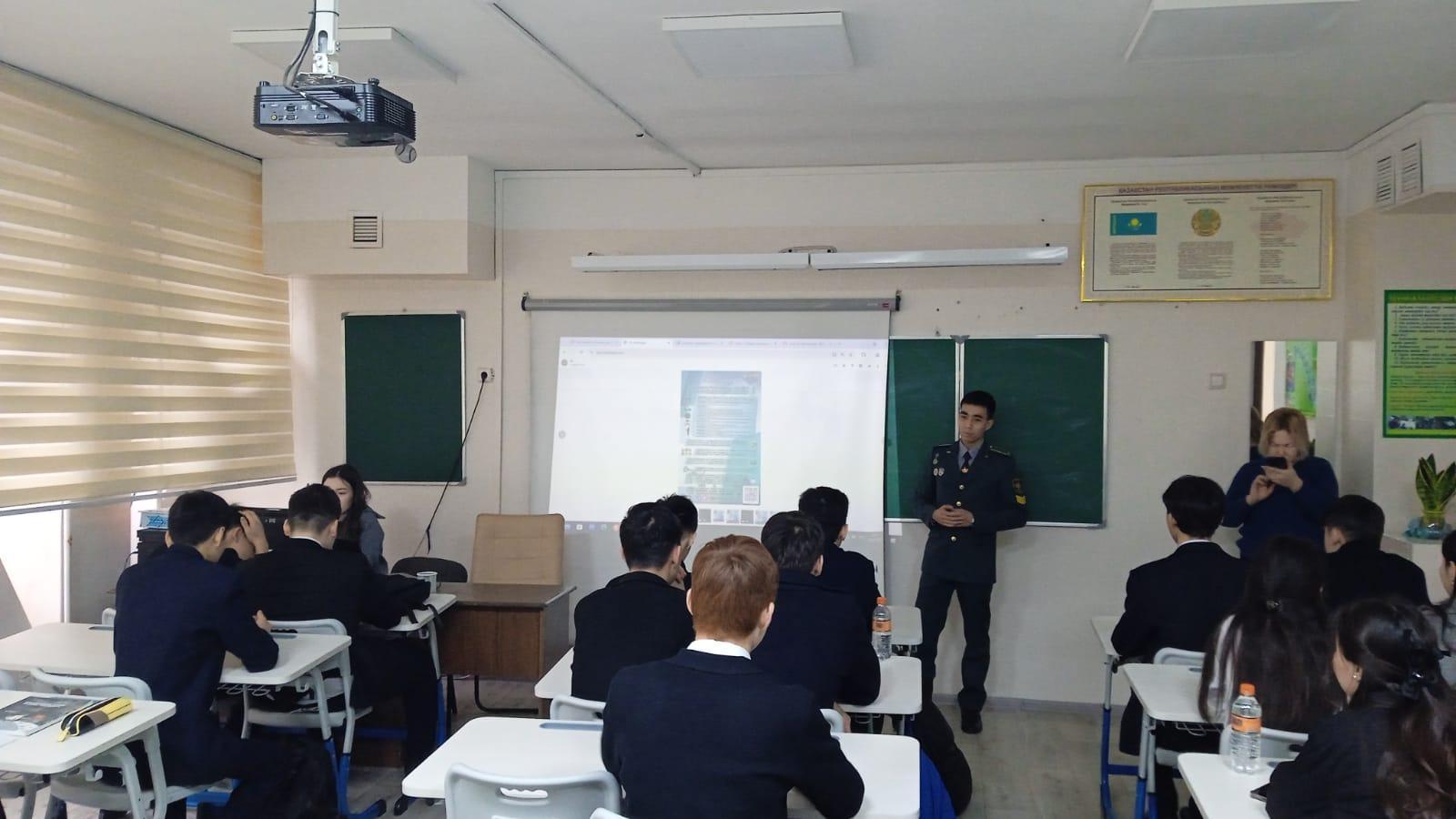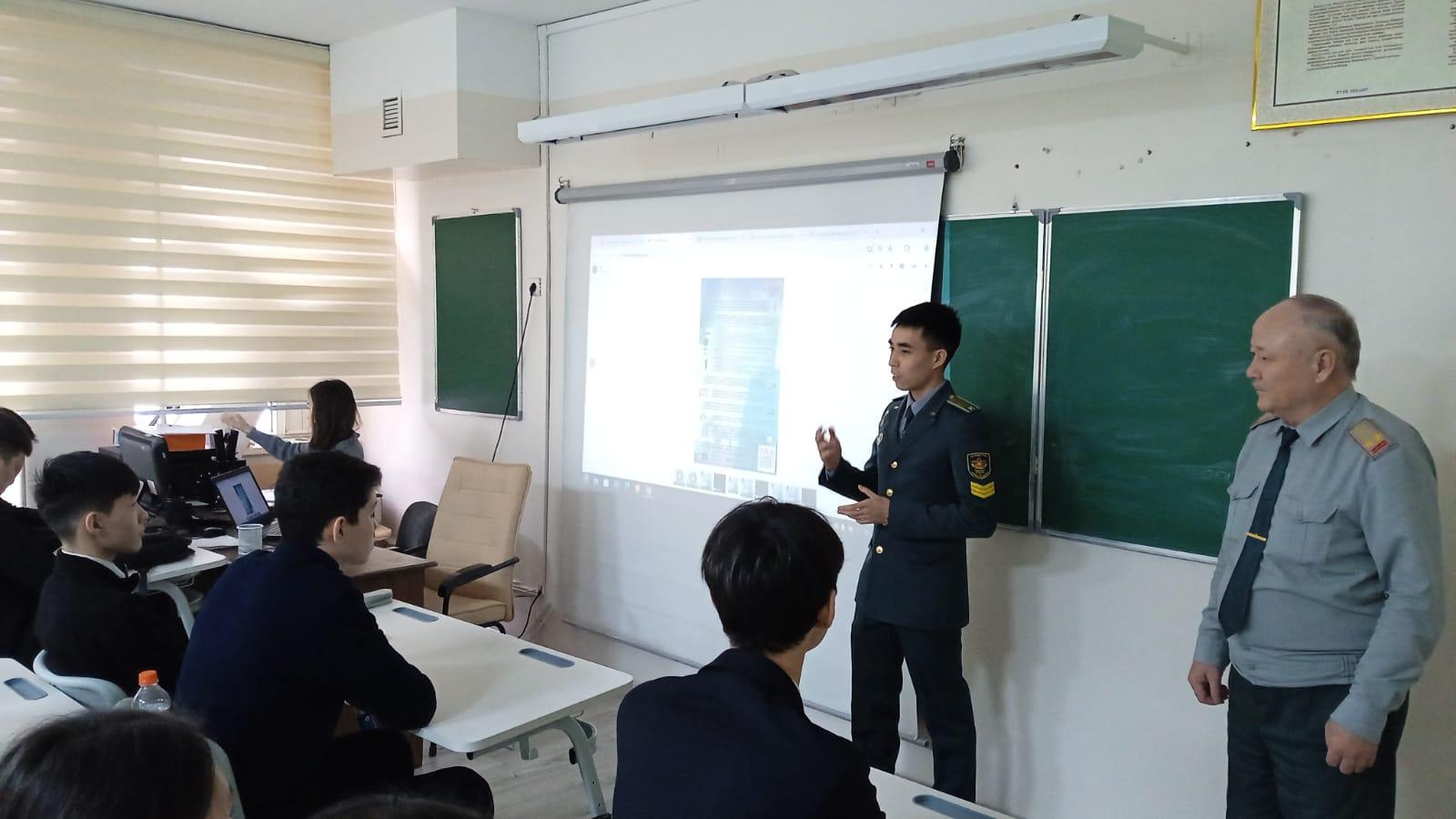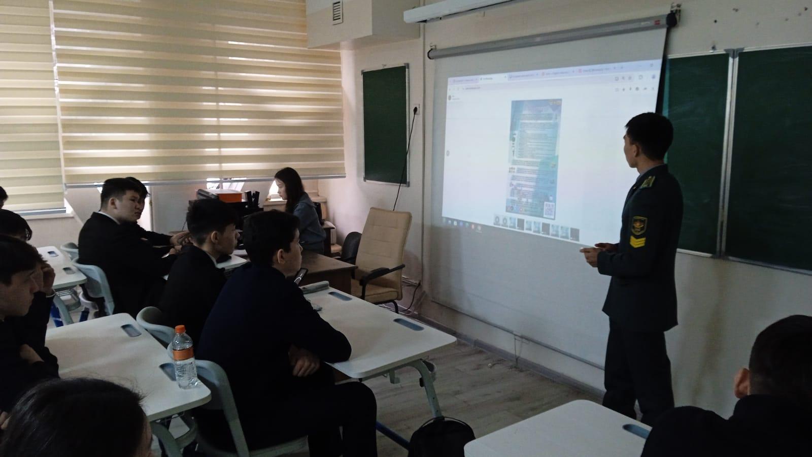 10-11 сынып оқушыларымен "Қазақстан республикасының әскери оқу орындарында білім алудың ерекшеліктері тақырыбында кәсіптік бағдар беру бойынша кездесу өткізді.