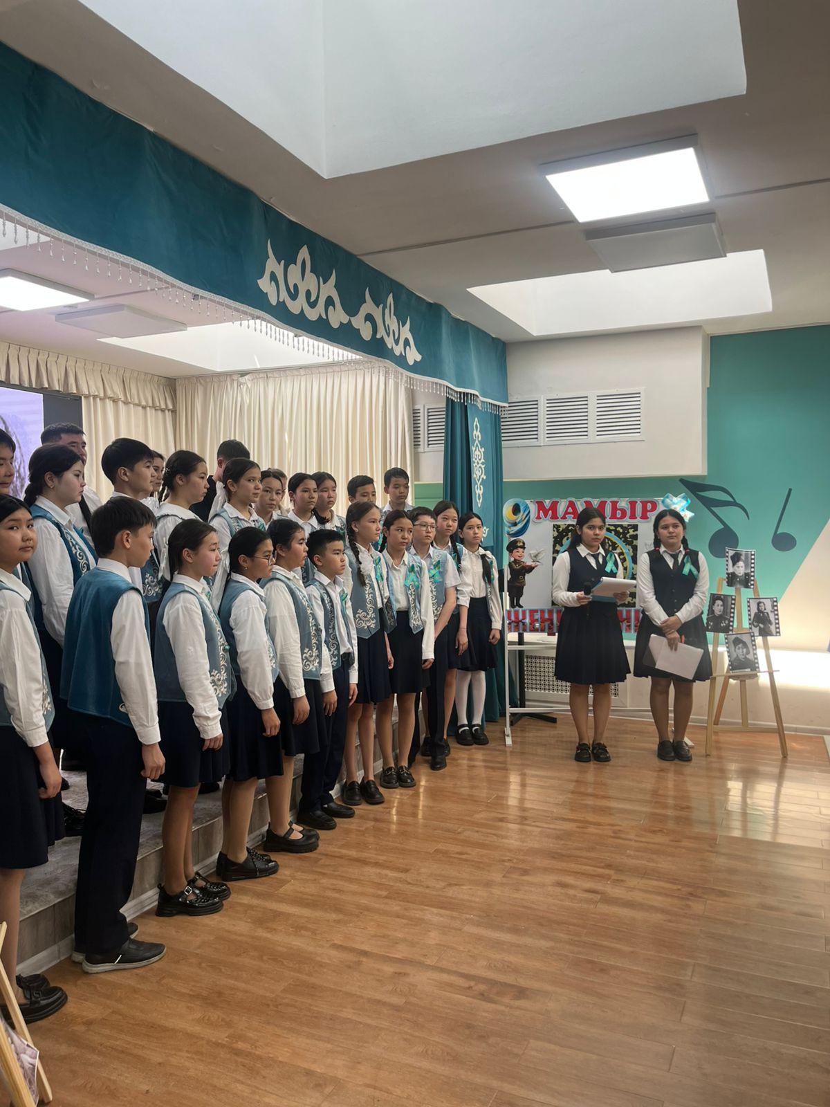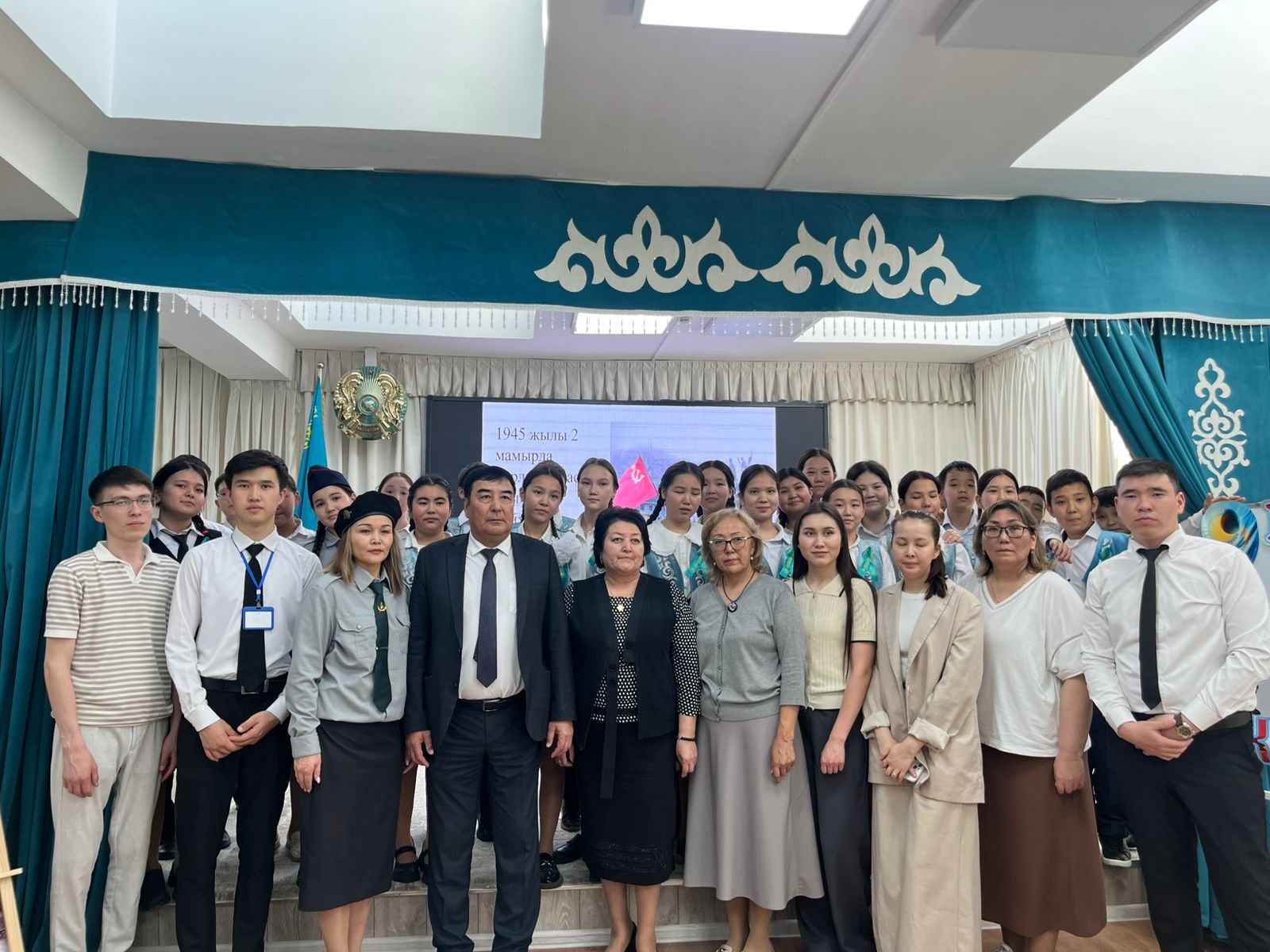 Ұлы Жеңістің 80 жылдығына орай "Ерлікке тағзым -ұрпаққа аманат" атты тақырыпта 6 "Б" және 6 "В" сынып оқушыларының қатысуымен мерекелік іс-шара өткізілді. Мақсаты: Жас ұрпақты бейбітшілікті сақтауға және нығайтуға, өз Отанын сүюге, Отанымыздың саясатын қолдауға,ерлікке, адал, батыл болуға тәрбиелеу. Мерекелік бағдарламада балалар өз өнерлерін тарту етті: патриоттық әндер шырқалып, әсерлі өлең шумақтары оқылды, би қойылымдары мен музыкалық аспапта орындалған шығармалар кештің көркін келтірді. Бұл өнер туындылары — аға буынға деген шексіз құрмет пен ризашылықтың айғағы. Ұйымдастырушылар сынып жетекшілеірі Иманалиева Венера , Сейтимбетова Асель
