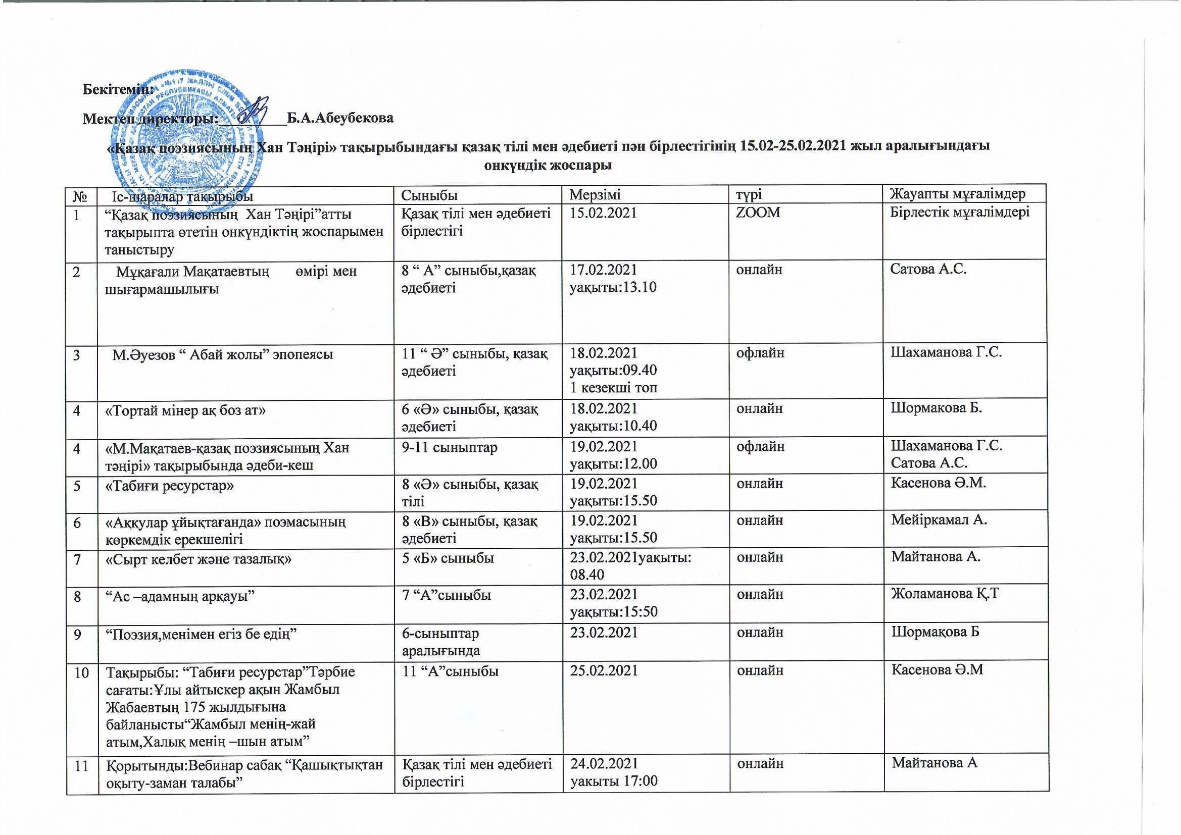 15 февраль 2021 0 1 2 3 4 5 «Қазақ поэзиясының Хан Тәңірі» тақырыбындағы қазақ тілі мен әдебиеті пән бірлестігінің 15.02-25.02.2021 жыл аралығындағы онкүндік жоспары Осы беттің QR-коды:QR-код этой страницы: