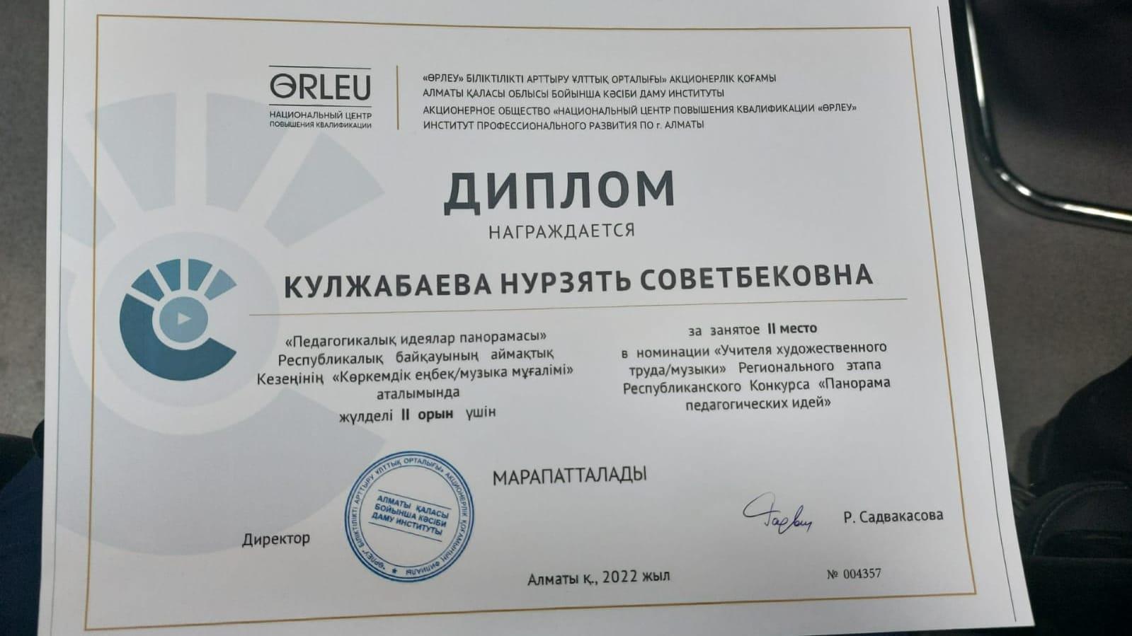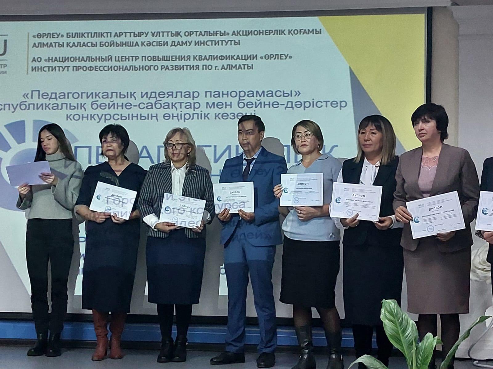 Қазан айында бірыңғай ақпараттық-білім кеңістігінде заманауи педагогикалық тәжірибені жинақтау және насихаттау, педагогтардың ақпараттық- коммуникациялық және технологиялық құзыреттіліктерін арттыру мақсатында «Өрлеу» БАҰО» АҚ Алматы қаласы кәсіби даму институтының ұйымдастыруымен өткен Мектепке дейінгі, орта, қосымша, техникалық және кәсіптік, жоғары білім ұйымдары үшін бейнесабақтар мен бейнедәрістердің жыл сайынғы «Педагогикалық идеялар панорамасы» Республикалық конкурсының аймақтық кезеңіне мектебіміздің тәжірибелі ұстазы, көркем еңбек пәнінің мұғалімі Кулжабаева Нурзять Советбекқызы қатысып, жүлделі 2-орынды жеңіп алды.