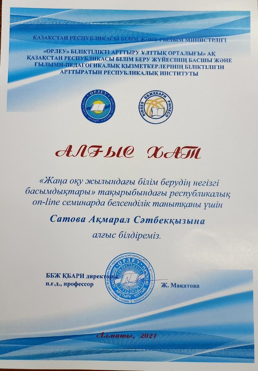 07 сентябрь 2021 0 1 2 3 4 5 Құттықтаймыз! "Жаңа оқу жылындағы білім берудің негізгі басымдылықтары" тақырыбындағы республикалық on-line семинарда белсенділік танытып алғыс хатын алған Сатова Ақмарал Сәтбекқызын құттықтаймыз! Осы беттің QR-коды:QR-код этой страницы: