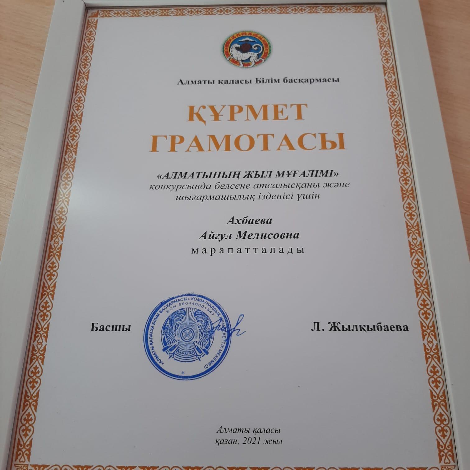 18 октябрь 2021 0 1 2 3 4 5 Құттықтаймыз! "Алматының жыл мұғалімі" конкрусына атсалысқаны және шығармашылық ізденісі үшін бастауыш сынып мұғалімі Ахбаев Айгүл Құрмет грамотасымен марпатталды. Осы беттің QR-коды:QR-код этой страницы: